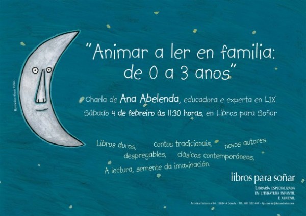 A educadora Ana Abelenda vai impartir este sábado 4 de febreiro, a partir das 11:30 horas, unha charla titulada “Animar a ler en familia: de 0 a 3 anos”. Nesta sesión aberta ao público -en especial a futuros pais e nais- que se vai celebrar na libraría LIBROS PARA SOÑAR (Avda. Fisterra, 64), abordaranse diversos consellos e estratexias para cantar e contar, para crear o hábito lector nos nenos e nas nenas dende os primeiros anos de vida, antes de que aprendan a ler, partindo dende a tradición oral e musical galega, e chegando ata o álbum ilustrado.