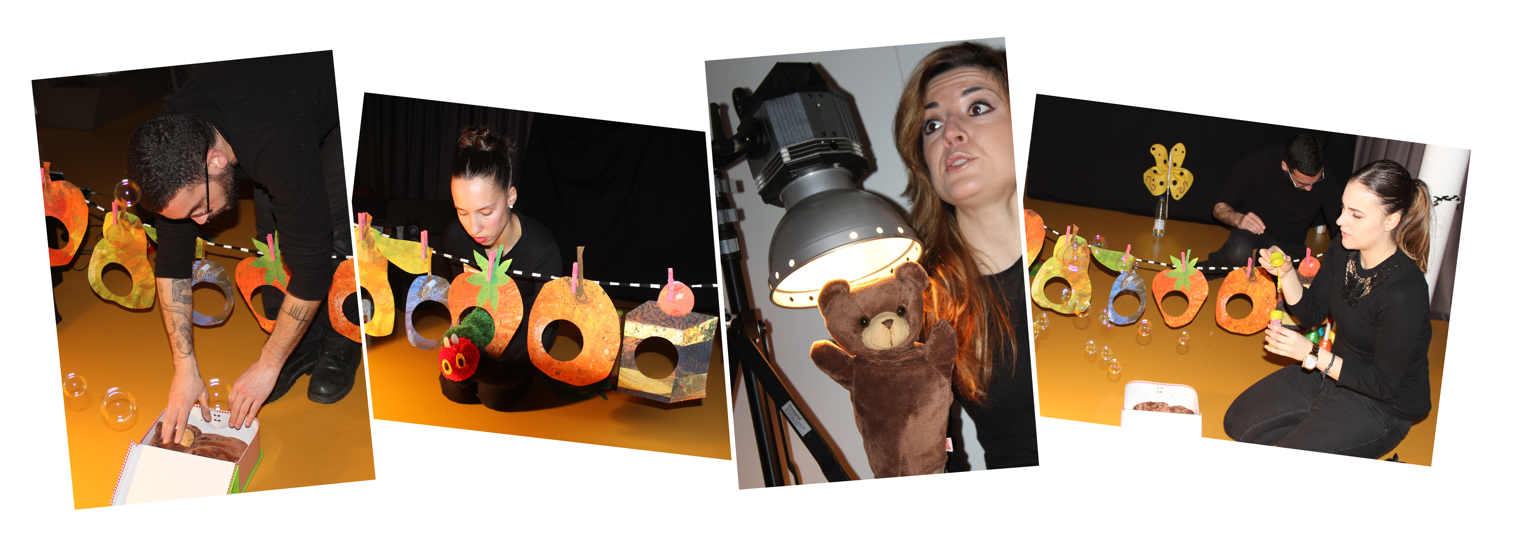 Co obxectivo de estimular a atención dos bebés, plantexamos un xogo rítmico de luces e sombras. Sinxelas ilustracións, nas que predominaron os fondos brancos, servíronnos para que os bebés e as súas familias recoñeceran, identificaran e imaxinaran ser cada un dos animais que Eric Carle ilustrou no seu conto Oso pardo, oso pardo … que ves?