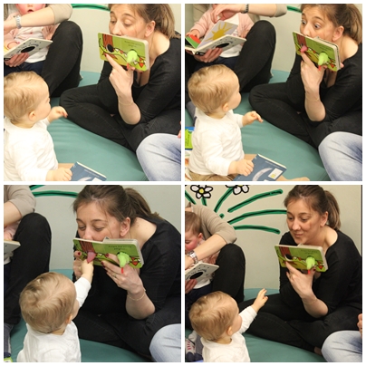 Sin duda alguna, vuestra creatividad constituye un elemento sustancial para que ese momento con los libros y la palabra se convierta en ese importante estímulo para el desarrollo afectivo y cognitivo del bebé. En esta secuencia de imágenes podéis ver como juega con el libro “la serpiente Sisí” Fiz junto a su mamá .