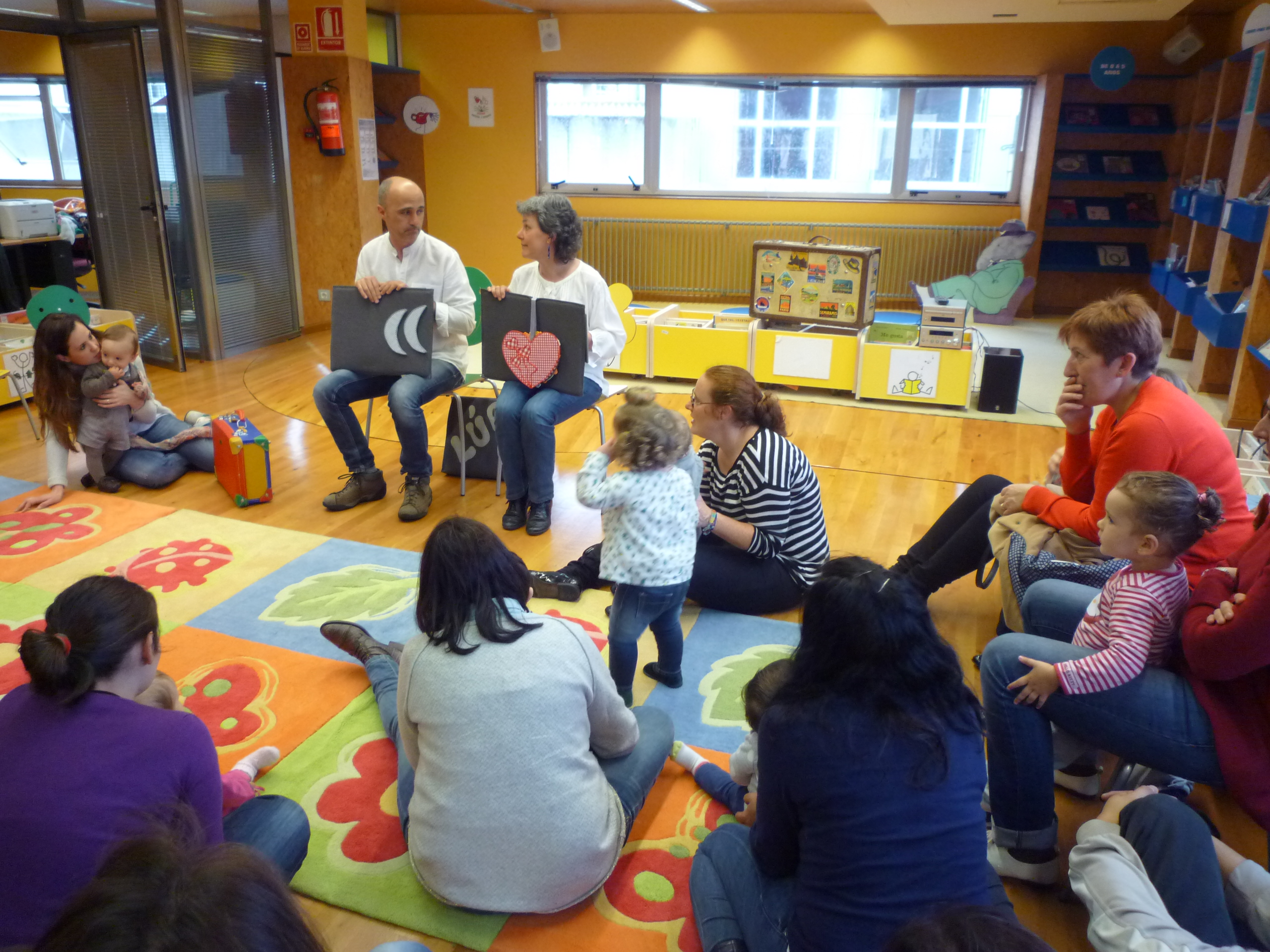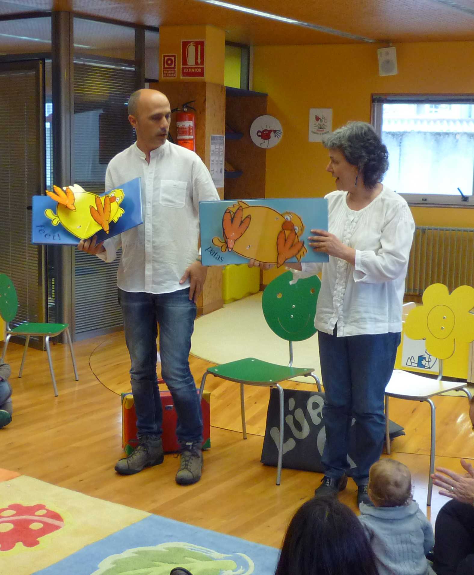 A pesar de que aquela tarde foi chuviosa, eles conseguiron facer da biblioteca un lugar cálido e seguro. Descubrimos canto lles gusta xogar á lúa e o sol; canto come o Polo Pepe e o gordecho que se está a volver; cantos amigos fixo o señor Coc mentres intentaba descubrir quen era. E tamén cantamos cancións coa axuda dos nosos dediños e duns axóuxeres artesáns que Xacobe e Tareixa prestáronnos para a ocasión.