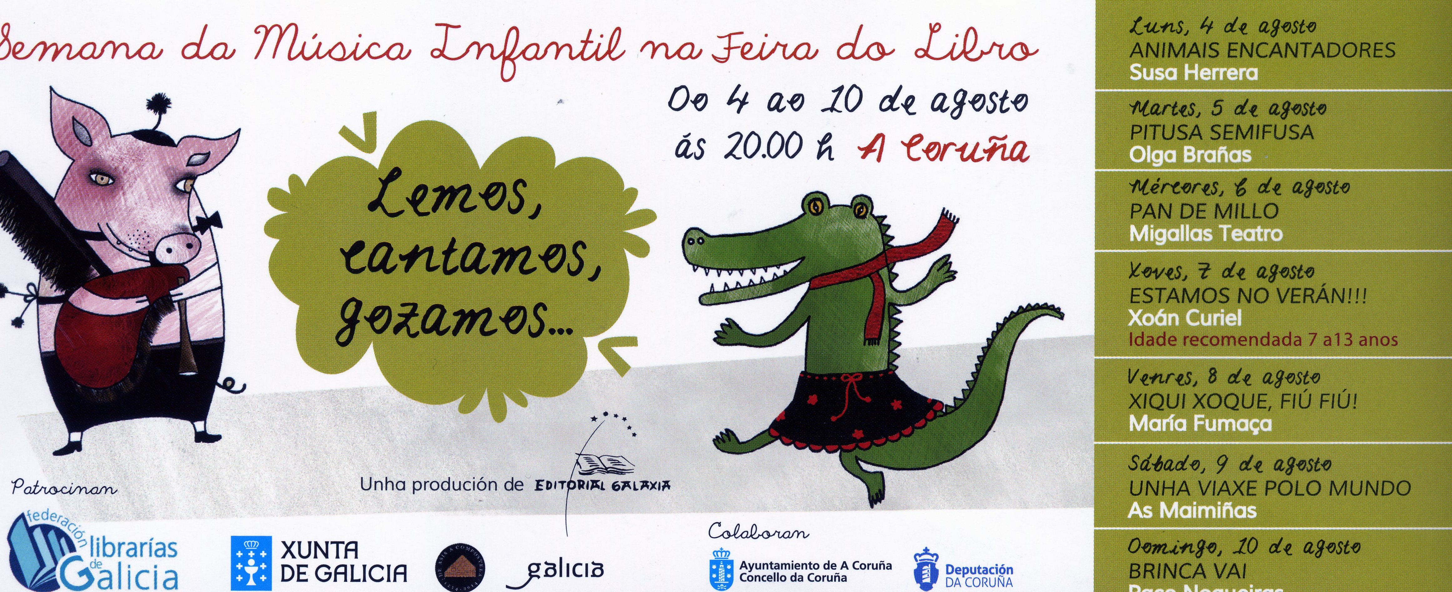 E, a partir do luns 4, ofrécenos unha nova edición do festival de música e lectura infantil “Lemos, cantamos, gozamos” nunha das dúas carpas de actividades da feira: a partir das 20 horas poderemos cantar e bailar cos nosos pequenos na boa compaña de Susa Herrera, Olga Brañas, Migallas Teatro, Xoán Curiel, María Fumaça, As Maimiñas e Paco Nogueiras.
