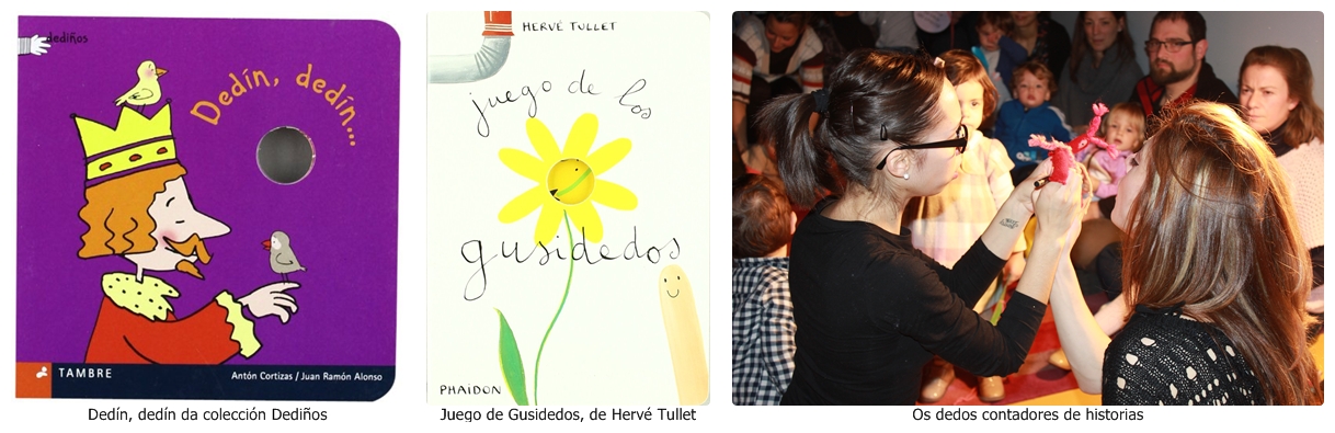 É por iso que tamén xogamos con todos e cada un dos títulos da colección de Dediños da Editorial Tambre. Dedín Dedín converteuse no protagonista principal, pero en cada unha das riolas de Antón Cortizas podíamos descubrir un xogo-rima procedente da tradición oral galega, ao tempo que os dediños furaban en cada unha das páxinas.