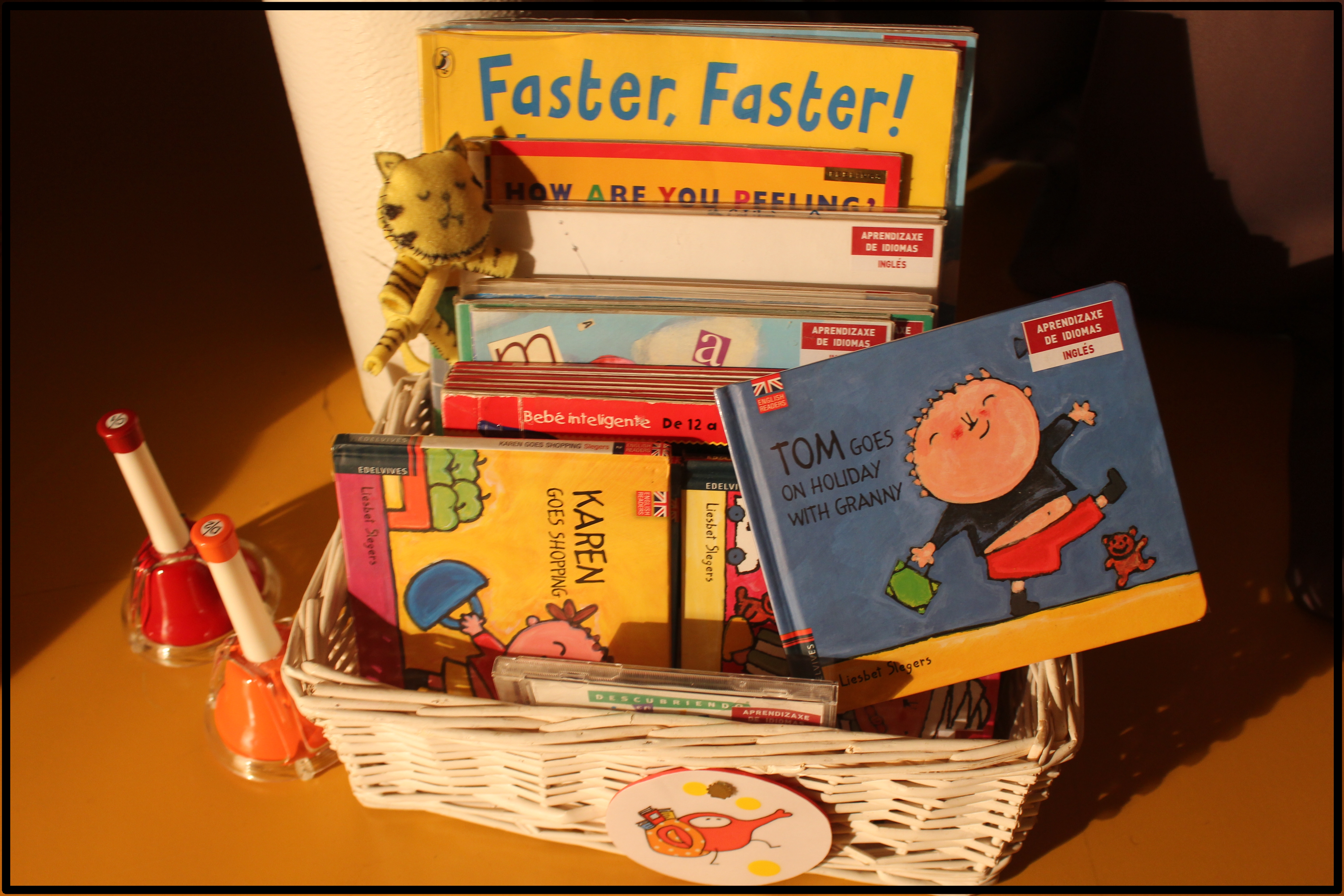 Explicacións detalladas á marxe, a nosa intención como bibliotecarixs non era outra que trasnformar as sonoridades en fíos argumentais dunha historia sen narrativa, senón chea de imaxes tan cotiás como as partes do corpo ao movementos diarios como levantarse e sentarse. A finalidade? Perder o medo á introducción dun terceiro ou cuarto idioma na casa dende as primeiras idades