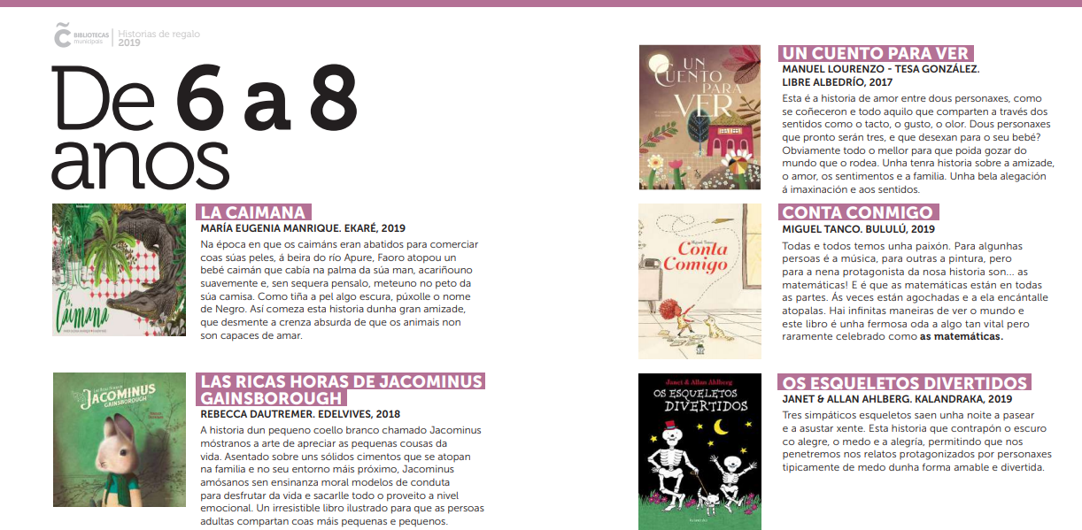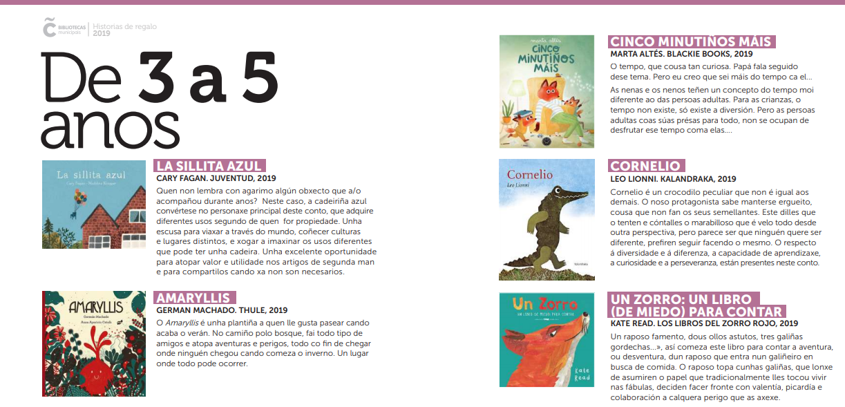 Como cada ano, as bibliotecarias queremos que entre os vosos agasallos de nadal non falten os libros, por iso elaboramos para vos a nosa guía de “Historias de regalo” onde recollemos unha escolma dos libros que destacamos para as diferentes idades; os títulos que che propoñemos van acompañados dunha reseña do seu contido e estarán expostos en todas as nosas bibliotecas onde poderás mirar, escoitar, tocar e ulir todas estas propostas.