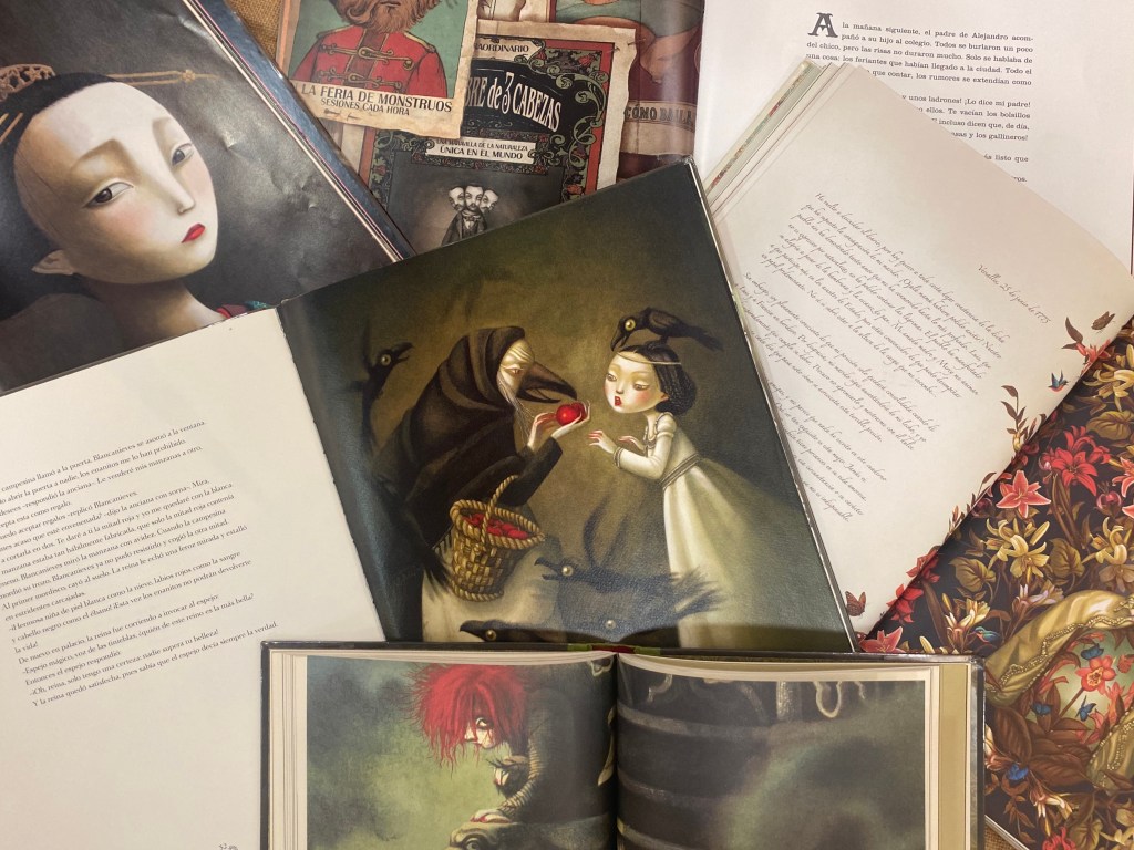 Superficial e envexosa é culpable de ofrecer comida envelenada á súa fillastra, á raíña máis fermosa do reino non lle treme o pulso á hora de recorrer á maxia negra e ao engano para conseguir o seu escuro propósito. Os Irmáns Grimm foron os encargados de poñer por escrito este relato “Brancaneves“, alá polo século XIX e no 2011 o clásico foi ilustrado por Benjamin Lacombe e publicado pola editorial Edelvives.