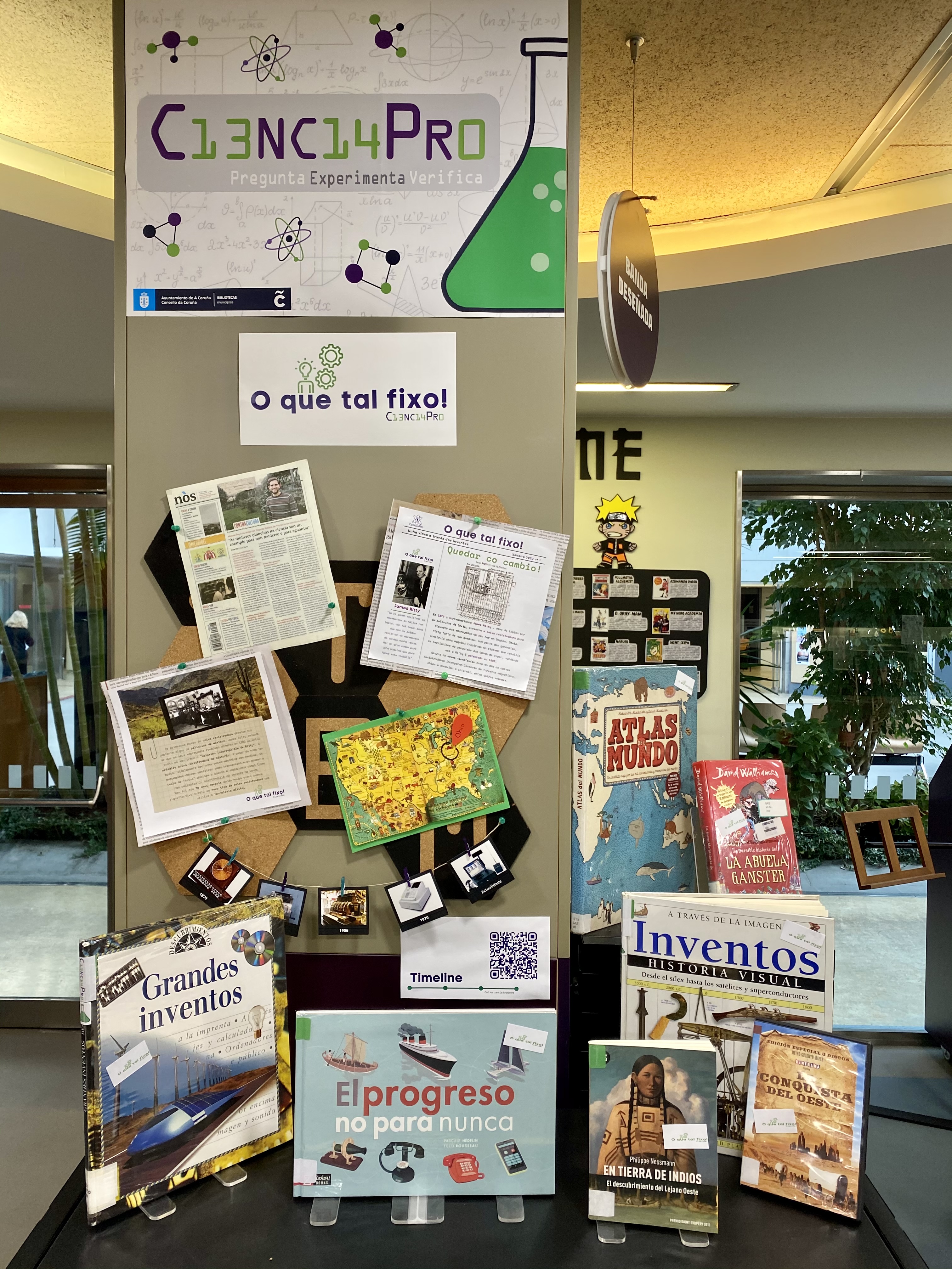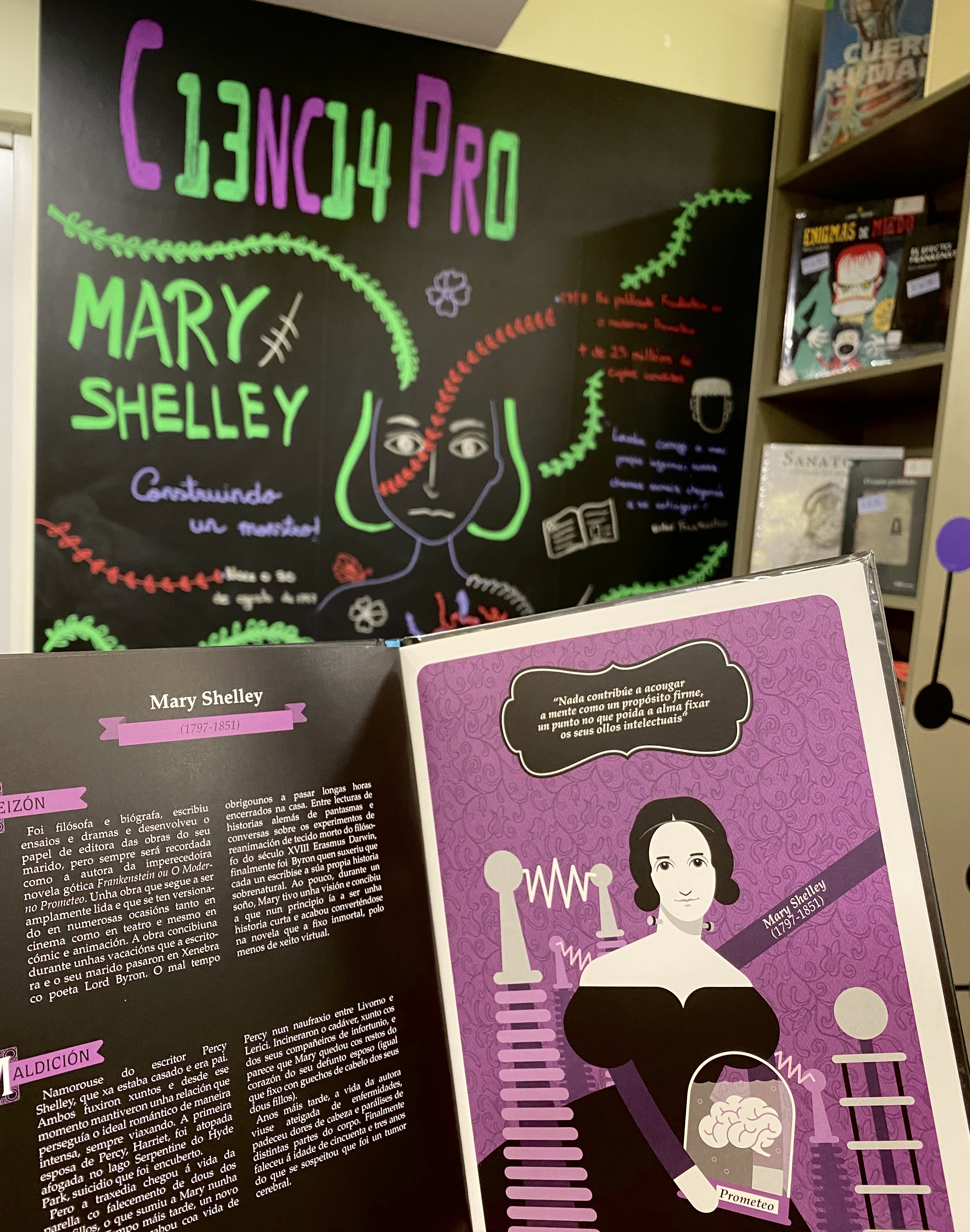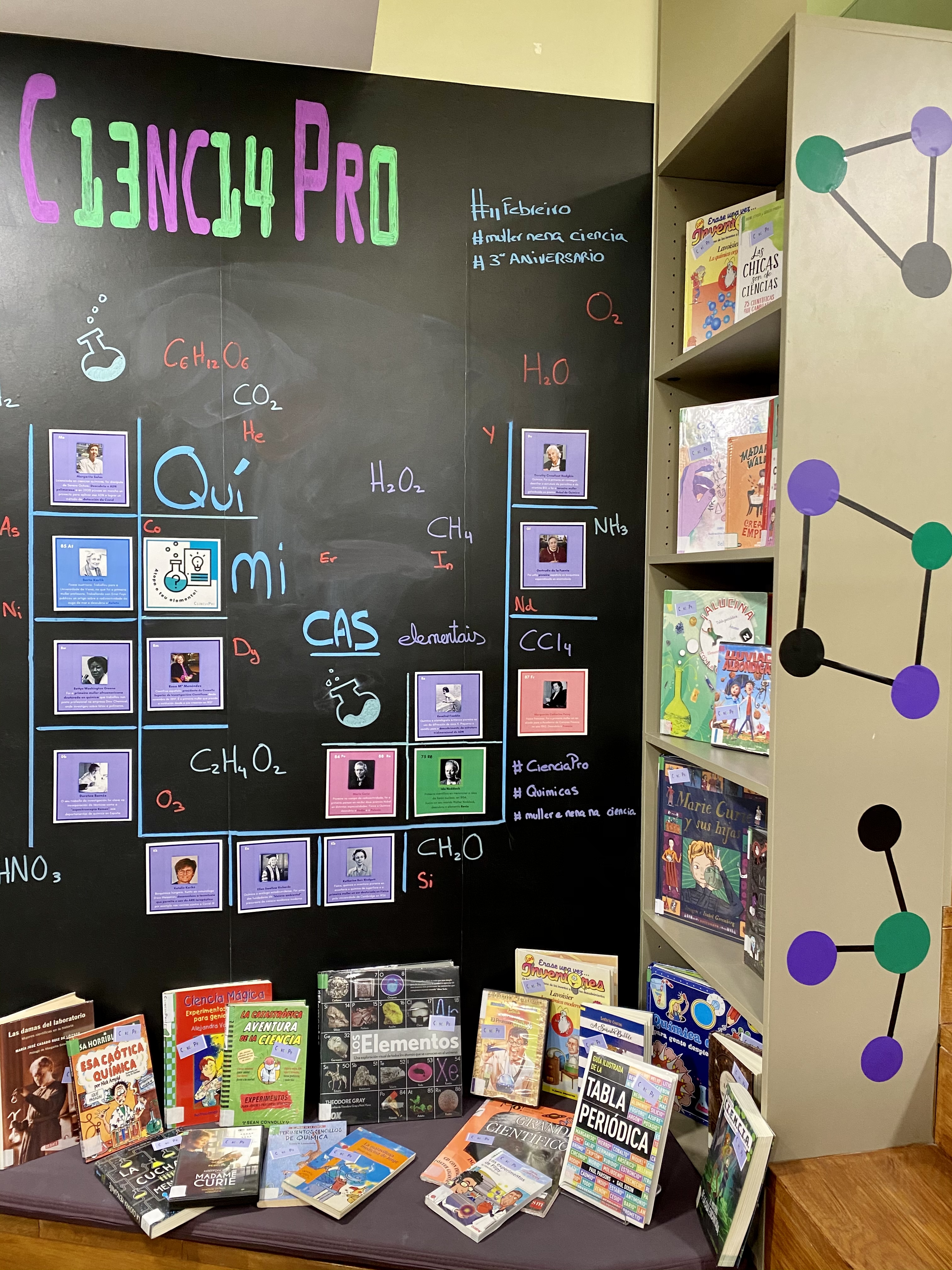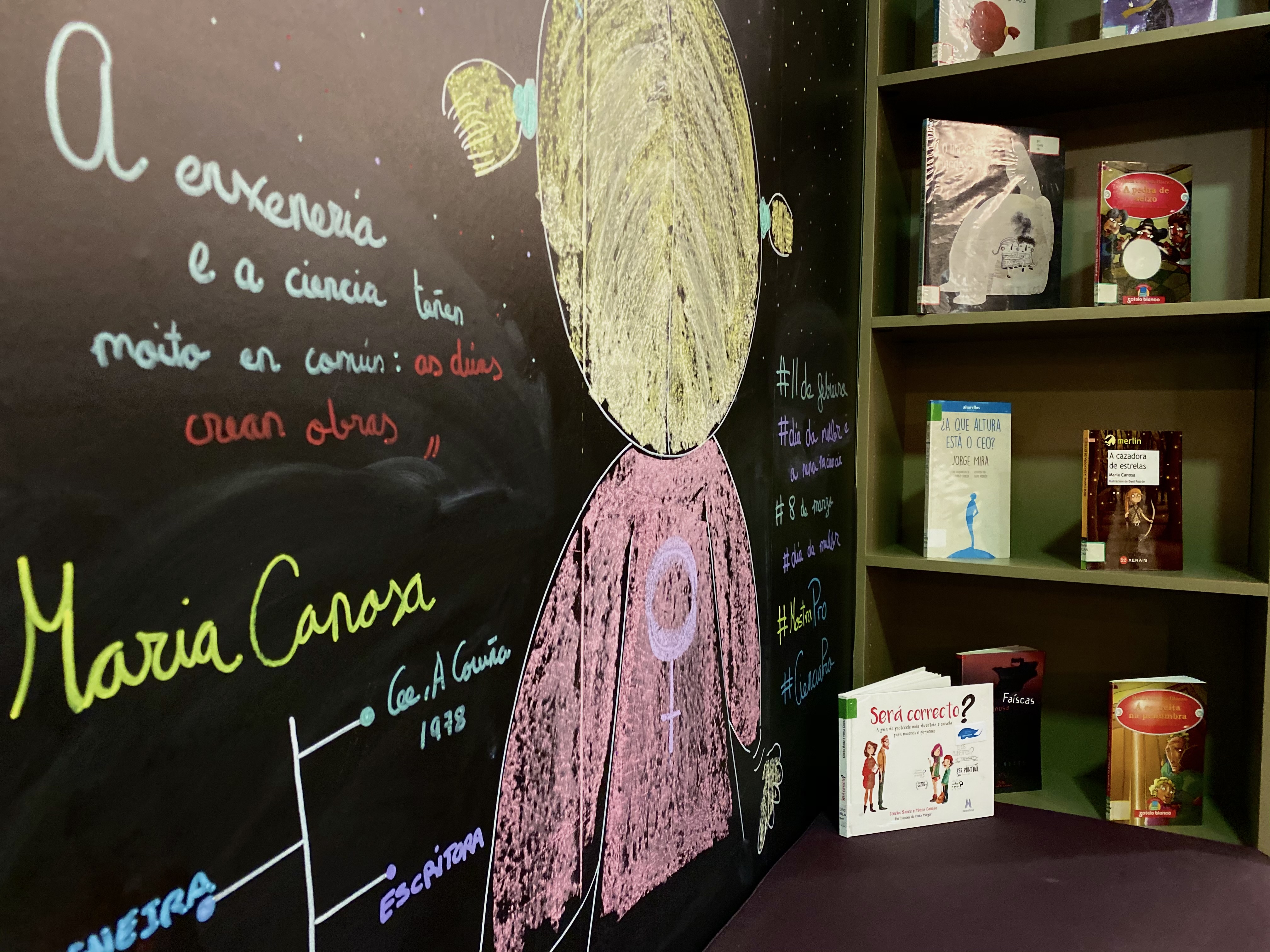 Aquí podedes ver algunhas das mostras bibliográficas que realizamos nestes tres anos: “A muller na ciencia, a muller na escrita” , “Mary Shelley, construindo un monstro” , “Sucando a ciencia”, “O universo“, “Químicas elementais“… desde a biblioteca Forum xeramos sinerxias para crear esa ponte de unión entre os libros e a cultura científica.